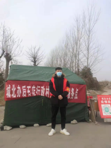 20电子商务技术一班郭宝,在周口市川汇区城北办事处参与防控疫情工作。疫情防控,人人有责。我积极响应学院号召,作为志愿者,参与社区出入口卡点防控措施的落实,为战“疫”贡献自己的力量。